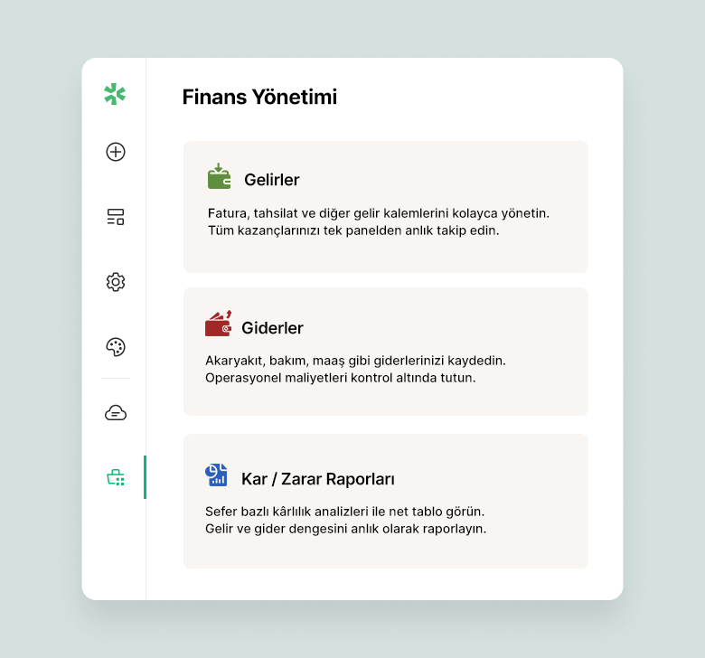 Yaptığınız işin size ne kazandırdığını bilin. Yakıt, maaş, gider ve gelir kalemleriyle sefer bazlı kârlılığı kolayca takip edin. Tahminle değil, veriye dayanarak karar verin.